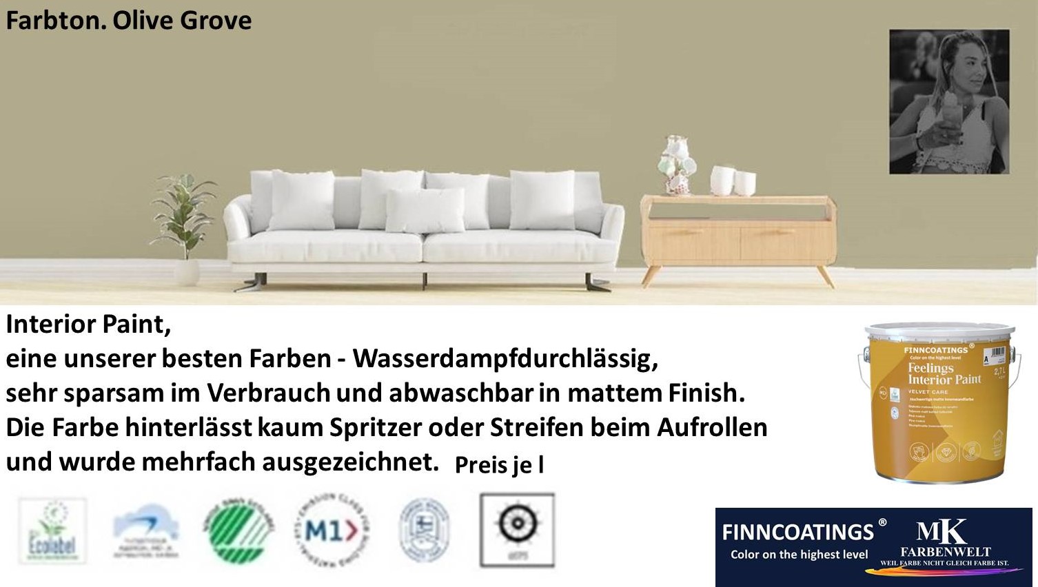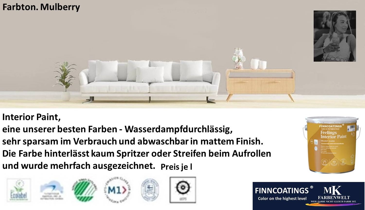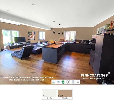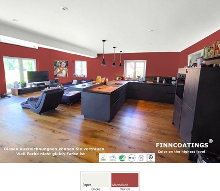 Die geruchsarme Innenraumfarbe-Formel hat einen sehr niedrigen VOC-Emissionsgrad. Dies wird durch M1- und EU-Ecolabel-Zertifikate bestätigt.