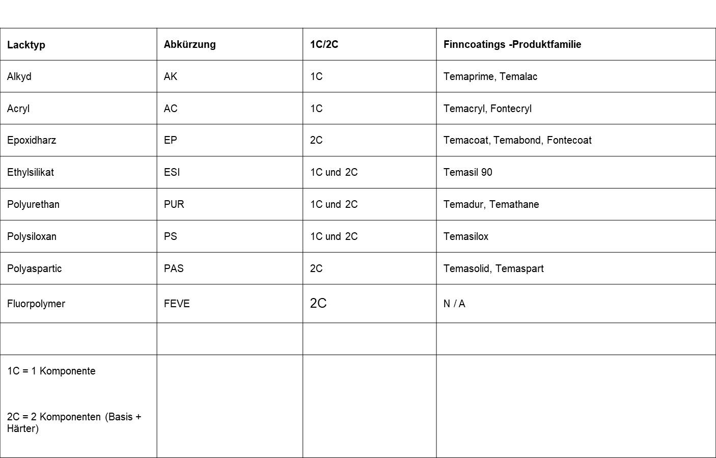 Finncoatings Produkte bedeuten kann , können Sie in der folgenden Tabelle sehen, wo verschiedene Stahlschutzbeschichtungen als Teil der Norm aufgeführt sind.